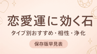 基礎知識・選び方 恋愛運に効く石の選び方|タイプ別おすすめ・相性・浄化【保存版早見表】 恋愛運に向く石をタイプ別に即比較。主効果・相性・組み合わせ・浄化の早見表とFAQで、最短で“自分に合う”を見つけます。 2025.09.24 基礎知識・選び方恋愛運