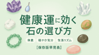 健康運 健康運に効く石の選び方|休息・穏やかな気分・生活リズム【保存版早見表】 健康運を「休息・穏やかな気分・生活リズム」の3タイプで即比較。主効果・相性・浄化の早見表とFAQで、無理なく“今の自分に合う”組み合わせが見つかります。 2025.09.26 健康運基礎知識・選び方